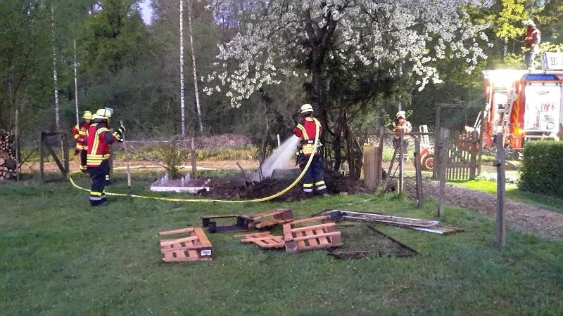 Innerhalb kurzer Zeit waren vier Löschfahrzeuge samt Besatzung vor Ort. Das Feuer konnte schnell gelöscht werden. Allerdings musste sicherheitshalber ein Teil der Holzverkleidung entfernt werden, um sicher zu gehen, dass keine Glutnester mehr vorhanden sind.